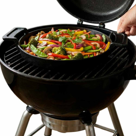 - Universelle : grâce à son fond plat et son diamètre de 30 cm, elle se pose sur la grille de cuisson de n'importe quel gril, brasero, ou même dans un four.